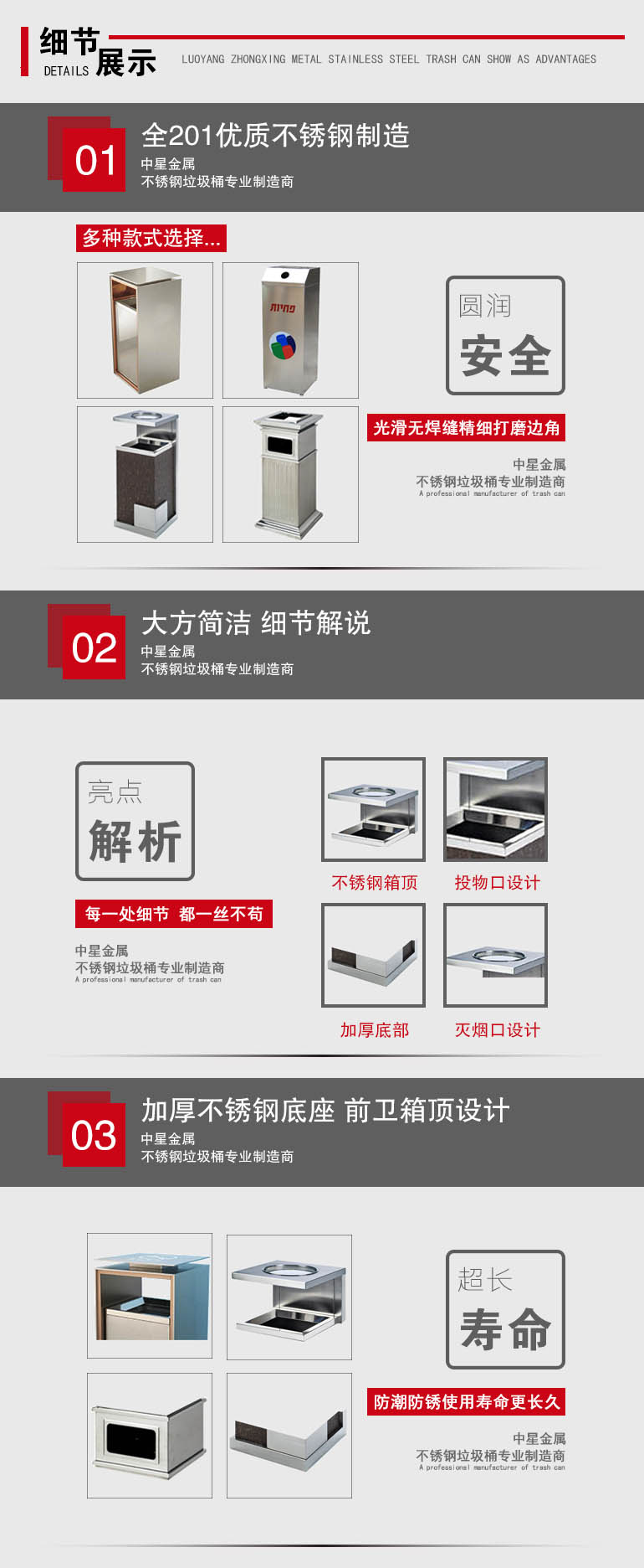 【品名】三分類垃圾桶 【品牌】 中星 【材質】優(yōu)質鍍鋅板 【內膽】鍍鋅板、不銹鋼 【制作工藝】選用優(yōu)質不銹鋼鋼板裁剪、壓制、折彎后再焊接而成型 【噴涂工藝】垃圾桶經磷化噴砂處理后采用戶...