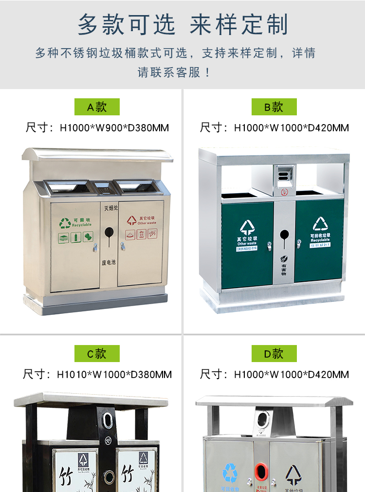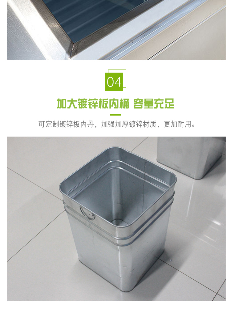 【品名】三分類垃圾桶 【品牌】 中星 【材質(zhì)】優(yōu)質(zhì)鍍鋅板 【內(nèi)膽】鍍鋅板、不銹鋼 【制作工藝】選用優(yōu)質(zhì)不銹鋼鋼板裁剪、壓制、折彎后再焊接而成型 【噴涂工藝】垃圾桶經(jīng)磷化噴砂處理后采用戶...