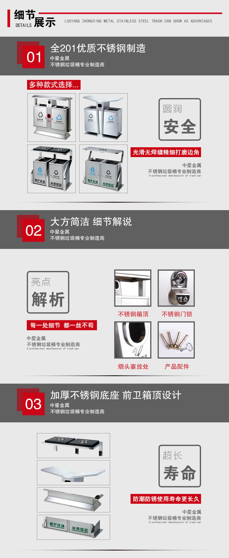 【品名】三分類垃圾桶  【品牌】 中星  【材質(zhì)】優(yōu)質(zhì)鍍鋅板  【內(nèi)膽】鍍鋅板、不銹鋼  【制作工藝】選用優(yōu)質(zhì)不銹鋼鋼板裁剪、壓制、折彎后再焊接而成型  【噴涂工藝】垃圾桶經(jīng)磷化噴砂處理后采用戶...