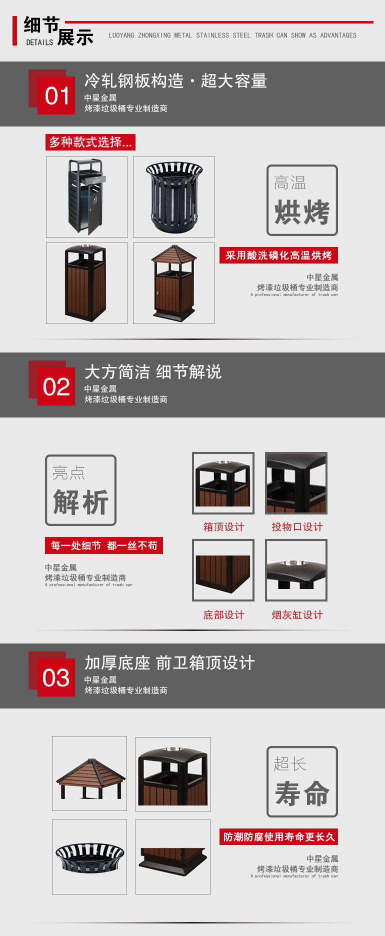 【品名】三分類垃圾桶  【品牌】 中星  【材質(zhì)】優(yōu)質(zhì)鍍鋅板  【內(nèi)膽】鍍鋅板、不銹鋼  【制作工藝】選用優(yōu)質(zhì)不銹鋼鋼板裁剪、壓制、折彎后再焊接而成型  【噴涂工藝】垃圾桶經(jīng)磷化噴砂處理后采用戶...