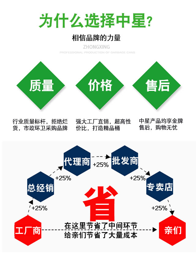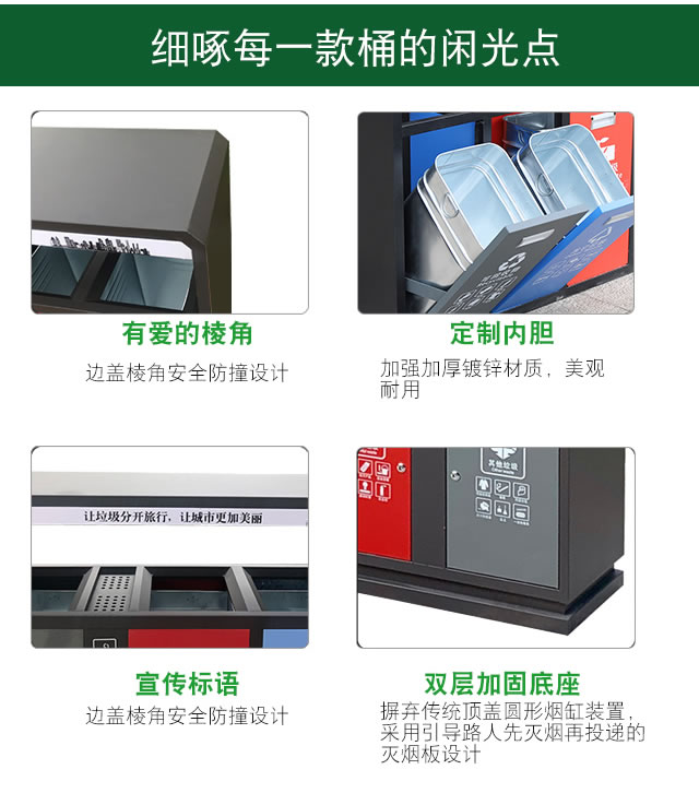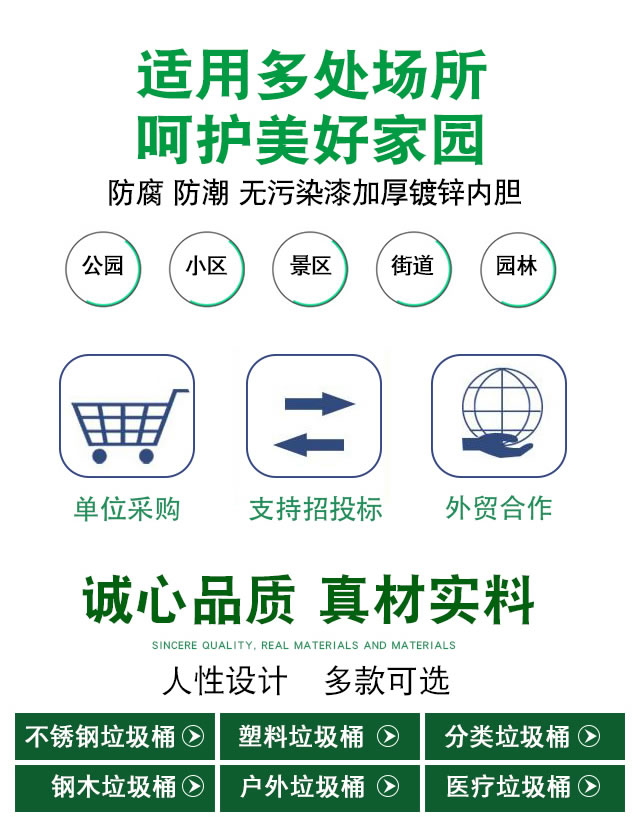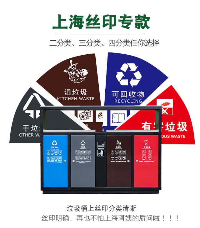 【品名】三分類垃圾桶 【品牌】 中星 【材質(zhì)】優(yōu)質(zhì)鍍鋅板 【內(nèi)膽】鍍鋅板、不銹鋼 【制作工藝】選用優(yōu)質(zhì)不銹鋼鋼板裁剪、壓制、折彎后再焊接而成型 【噴涂工藝】垃圾桶經(jīng)磷化噴砂處理后采用戶...