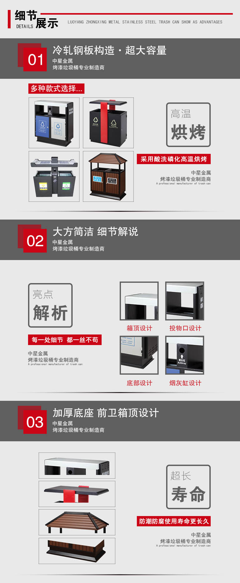 【品名】三分類垃圾桶  【品牌】 中星  【材質(zhì)】優(yōu)質(zhì)鍍鋅板  【內(nèi)膽】鍍鋅板、不銹鋼  【制作工藝】選用優(yōu)質(zhì)不銹鋼鋼板裁剪、壓制、折彎后再焊接而成型  【噴涂工藝】垃圾桶經(jīng)磷化噴砂處理后采用戶...