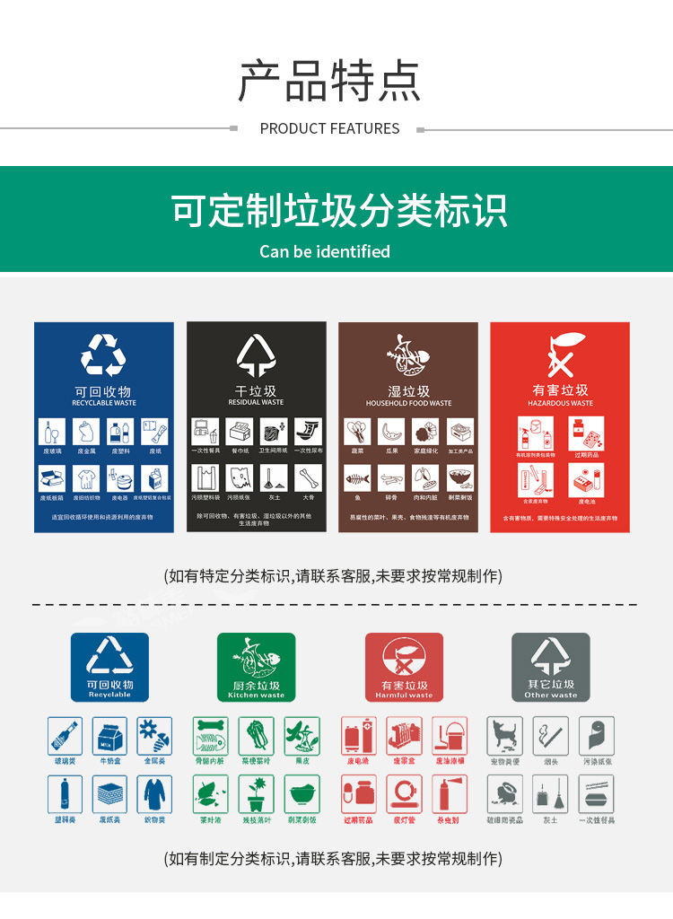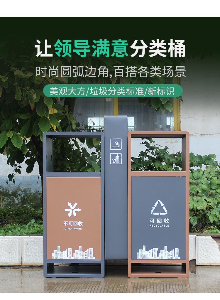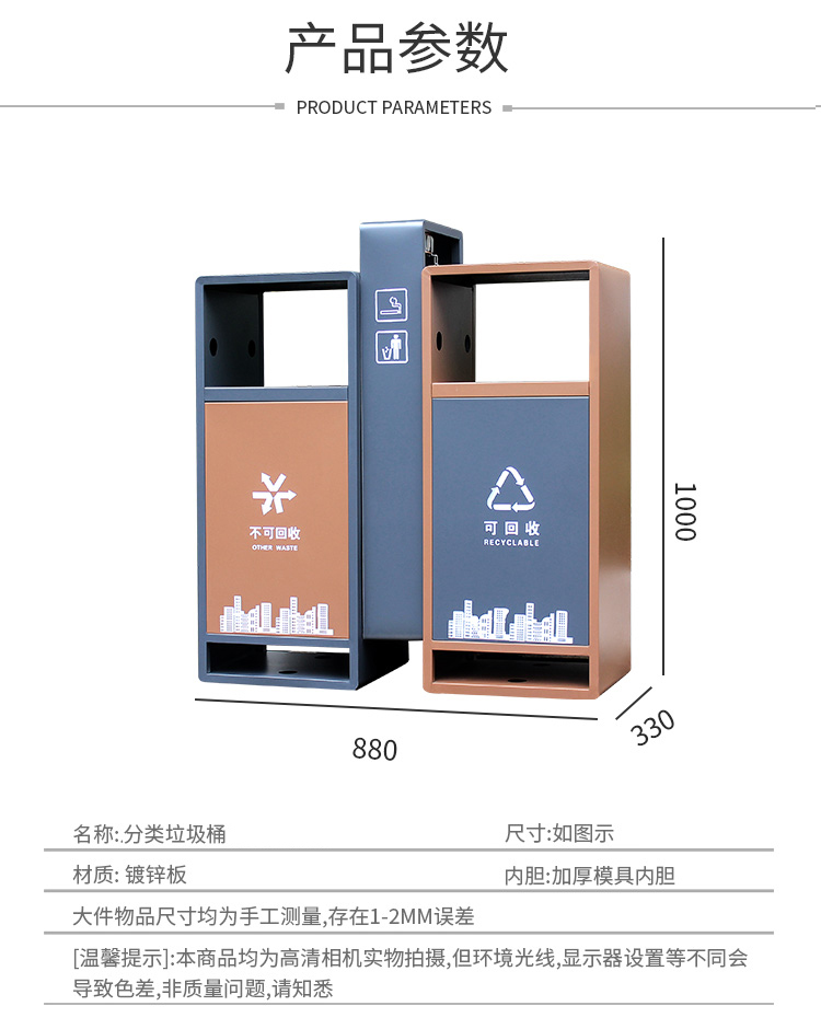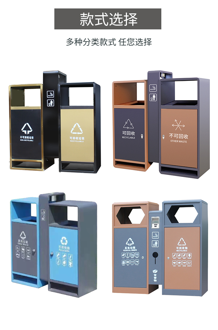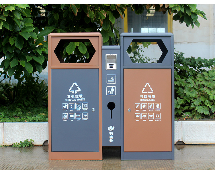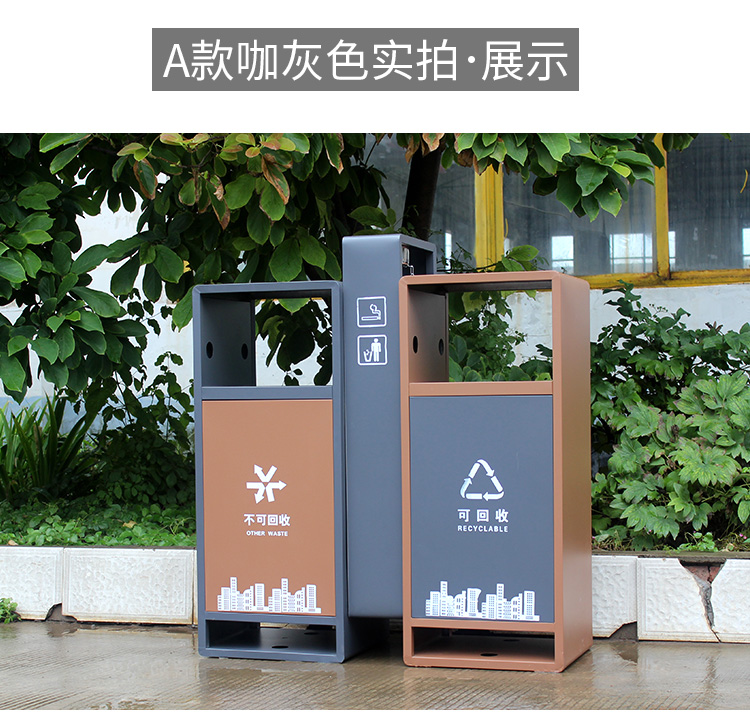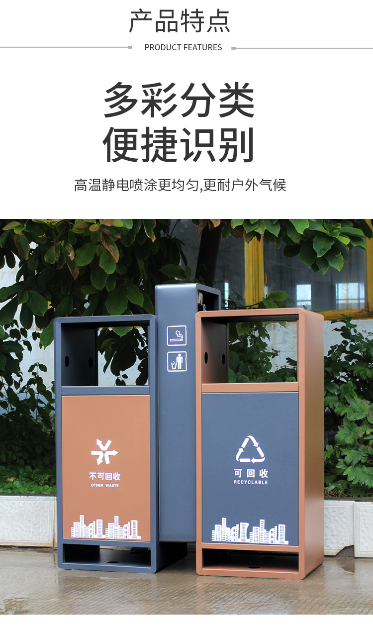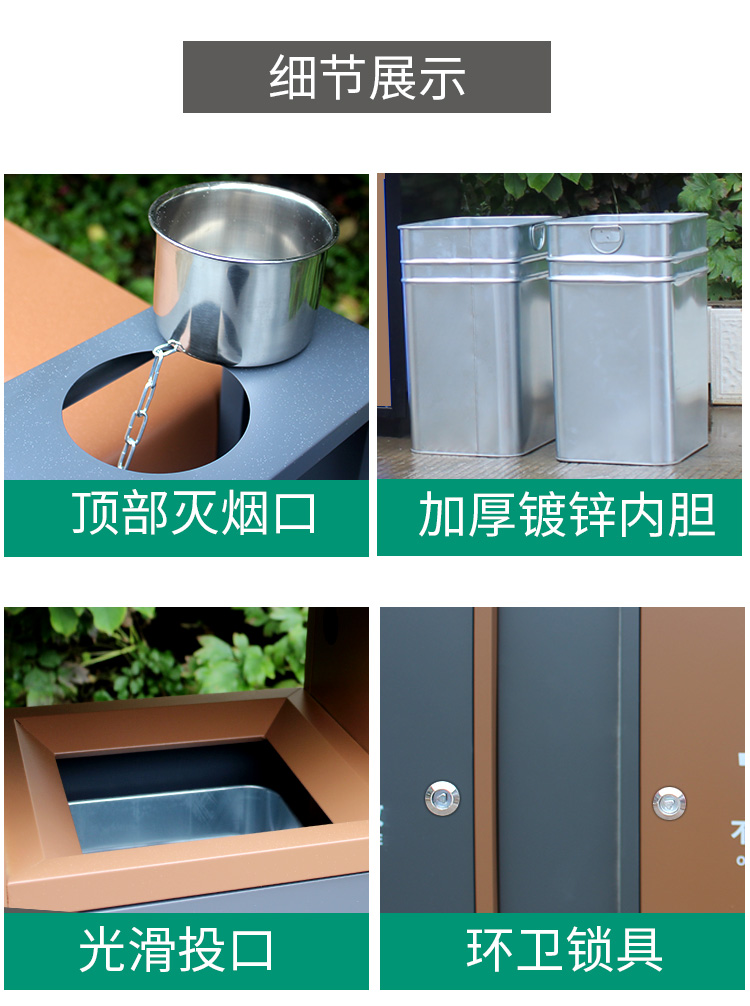 【品名】三分類垃圾桶 【品牌】 中星 【材質(zhì)】?jī)?yōu)質(zhì)鍍鋅板 【內(nèi)膽】鍍鋅板、不銹鋼 【制作工藝】選用優(yōu)質(zhì)不銹鋼鋼板裁剪、壓制、折彎后再焊接而成型 【噴涂工藝】垃圾桶經(jīng)磷化噴砂處理后采用戶...
