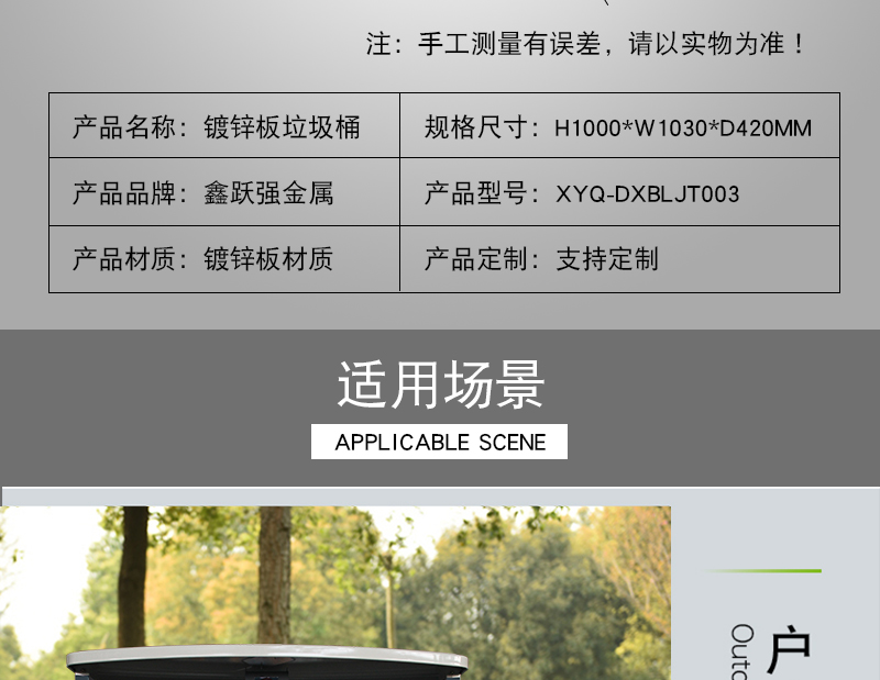 【品名】三分類垃圾桶 【品牌】 中星 【材質(zhì)】優(yōu)質(zhì)鍍鋅板 【內(nèi)膽】鍍鋅板、不銹鋼 【制作工藝】選用優(yōu)質(zhì)不銹鋼鋼板裁剪、壓制、折彎后再焊接而成型 【噴涂工藝】垃圾桶經(jīng)磷化噴砂處理后采用戶...