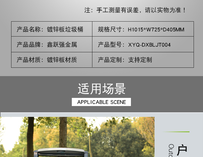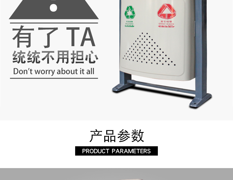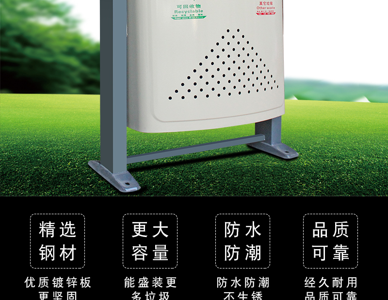 【品名】三分類垃圾桶 【品牌】 中星 【材質(zhì)】?jī)?yōu)質(zhì)鍍鋅板 【內(nèi)膽】鍍鋅板、不銹鋼 【制作工藝】選用優(yōu)質(zhì)不銹鋼鋼板裁剪、壓制、折彎后再焊接而成型 【噴涂工藝】垃圾桶經(jīng)磷化噴砂處理后采用戶...