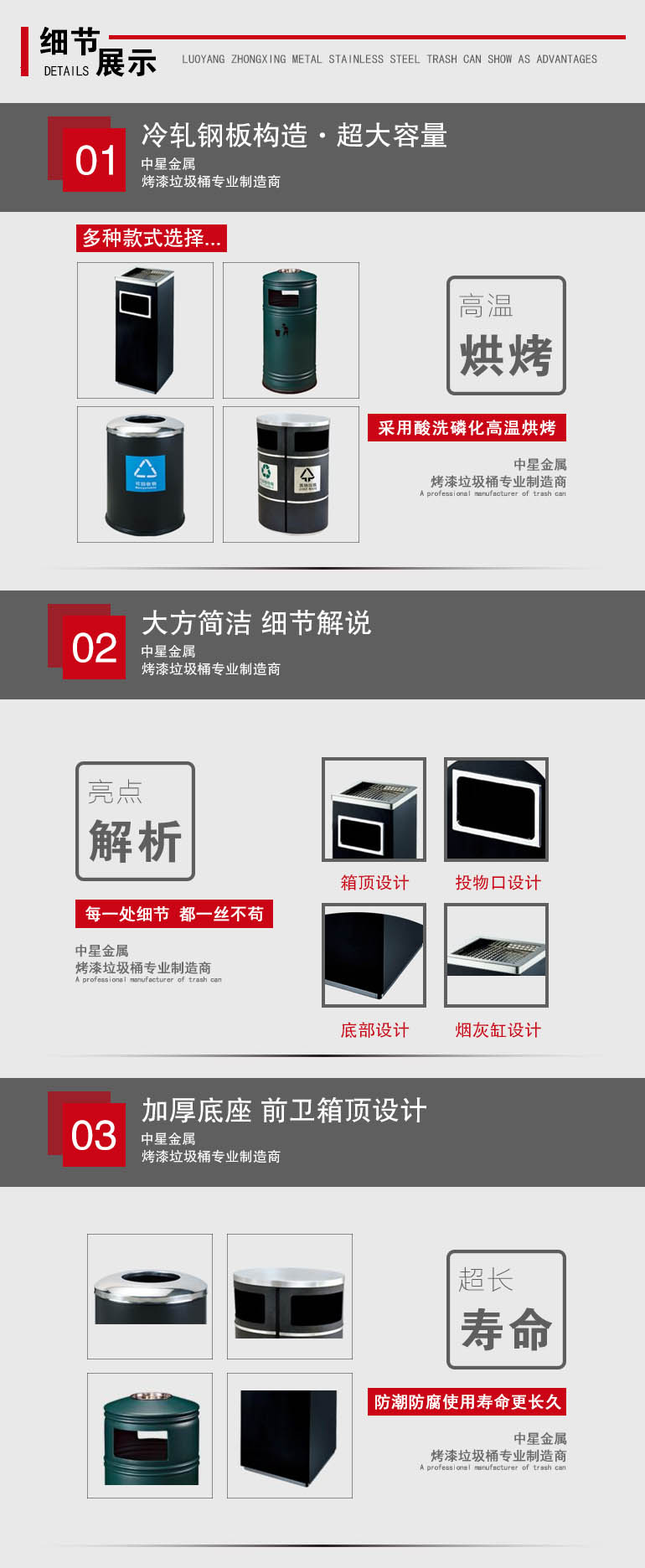 【品名】三分類垃圾桶  【品牌】 中星  【材質(zhì)】優(yōu)質(zhì)鍍鋅板  【內(nèi)膽】鍍鋅板、不銹鋼  【制作工藝】選用優(yōu)質(zhì)不銹鋼鋼板裁剪、壓制、折彎后再焊接而成型  【噴涂工藝】垃圾桶經(jīng)磷化噴砂處理后采用戶...
