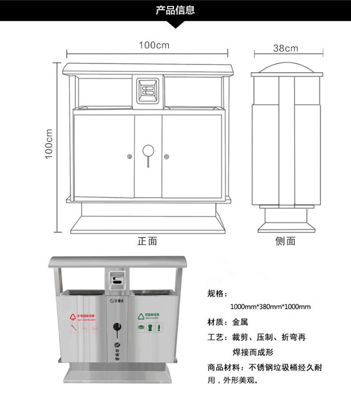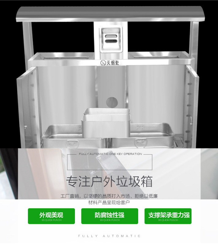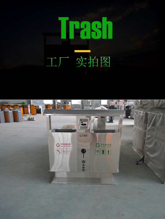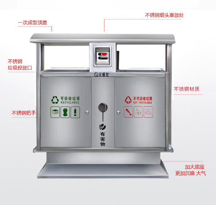 【品名】三分類垃圾桶 【品牌】 中星 【材質(zhì)】優(yōu)質(zhì)鍍鋅板 【內(nèi)膽】鍍鋅板、不銹鋼 【制作工藝】選用優(yōu)質(zhì)不銹鋼鋼板裁剪、壓制、折彎后再焊接而成型 【噴涂工藝】垃圾桶經(jīng)磷化噴砂處理后采用戶...