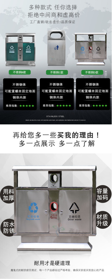 【品名】三分類垃圾桶  【品牌】 中星  【材質(zhì)】優(yōu)質(zhì)鍍鋅板  【內(nèi)膽】鍍鋅板、不銹鋼  【制作工藝】選用優(yōu)質(zhì)不銹鋼鋼板裁剪、壓制、折彎后再焊接而成型  【噴涂工藝】垃圾桶經(jīng)磷化噴砂處理后采用戶...