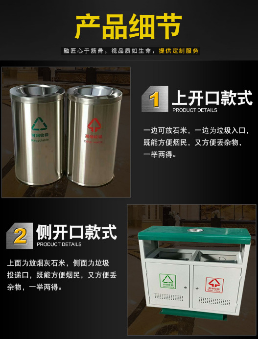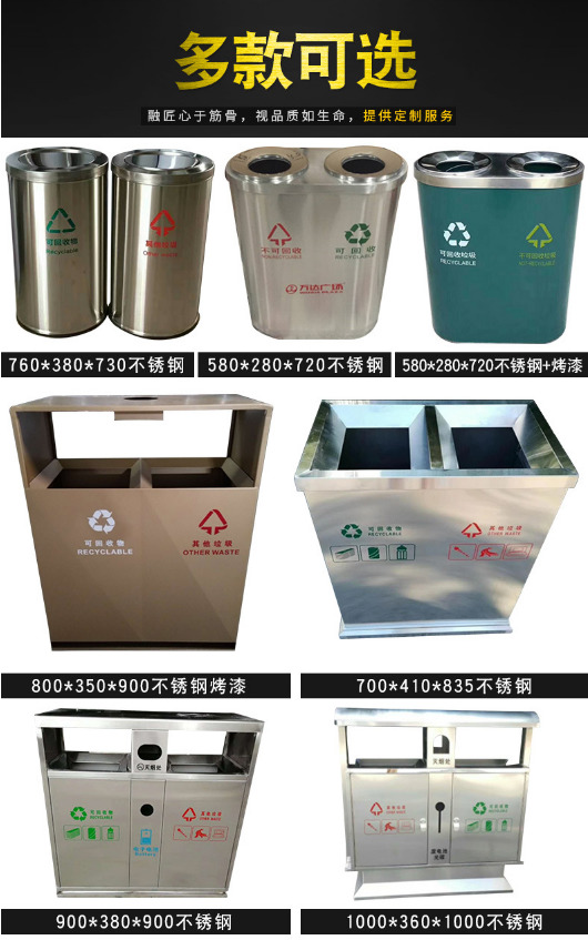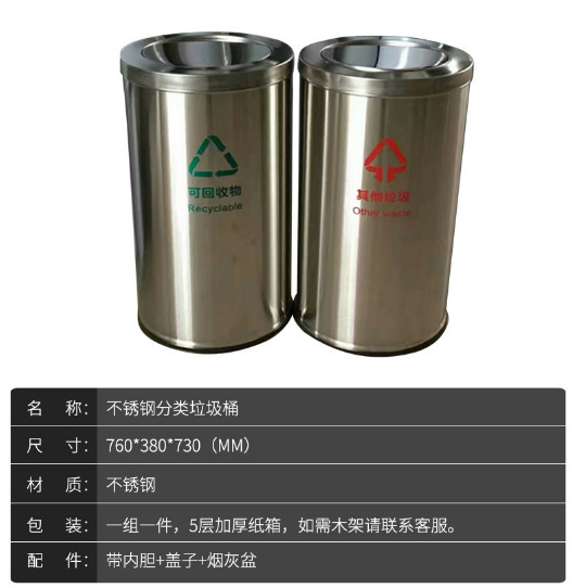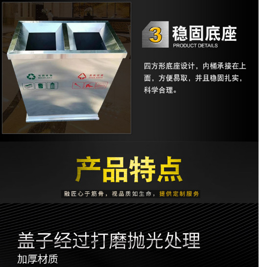 【品名】三分類垃圾桶  【品牌】 中星  【材質】優(yōu)質鍍鋅板  【內膽】鍍鋅板、不銹鋼  【制作工藝】選用優(yōu)質不銹鋼鋼板裁剪、壓制、折彎后再焊接而成型  【噴涂工藝】垃圾桶經磷化噴砂處理后采用戶...