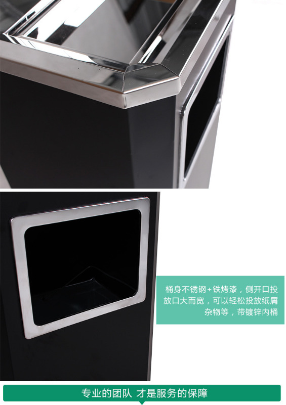 【品名】三分類(lèi)垃圾桶 【品牌】 中星 【材質(zhì)】?jī)?yōu)質(zhì)鍍鋅板 【內(nèi)膽】鍍鋅板、不銹鋼 【制作工藝】選用優(yōu)質(zhì)不銹鋼鋼板裁剪、壓制、折彎后再焊接而成型 【噴涂工藝】垃圾桶經(jīng)磷化噴砂處理后采用戶...