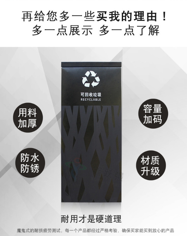【品名】三分類垃圾桶 【品牌】 中星 【材質(zhì)】?jī)?yōu)質(zhì)鍍鋅板 【內(nèi)膽】鍍鋅板、不銹鋼 【制作工藝】選用優(yōu)質(zhì)不銹鋼鋼板裁剪、壓制、折彎后再焊接而成型 【噴涂工藝】垃圾桶經(jīng)磷化噴砂處理后采用戶...