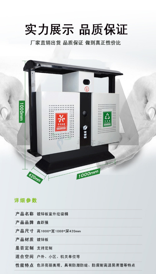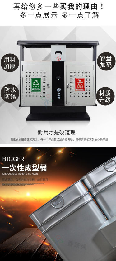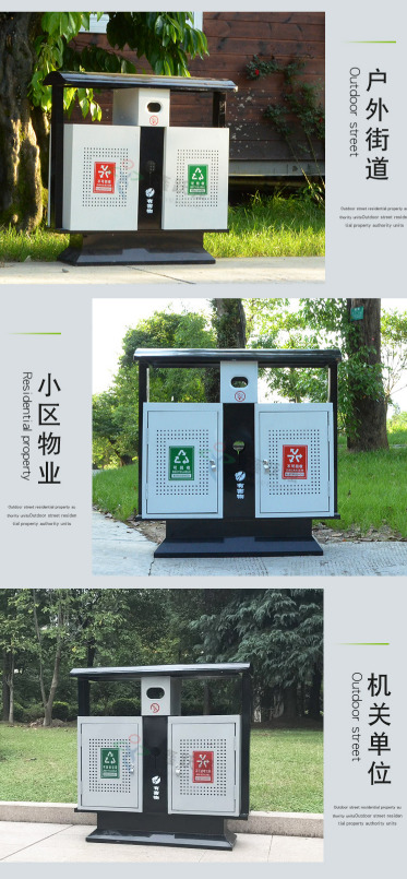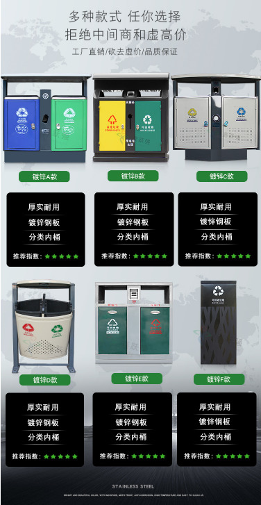 【品名】三分類垃圾桶 【品牌】 中星 【材質(zhì)】優(yōu)質(zhì)鍍鋅板 【內(nèi)膽】鍍鋅板、不銹鋼 【制作工藝】選用優(yōu)質(zhì)不銹鋼鋼板裁剪、壓制、折彎后再焊接而成型 【噴涂工藝】垃圾桶經(jīng)磷化噴砂處理后采用戶...