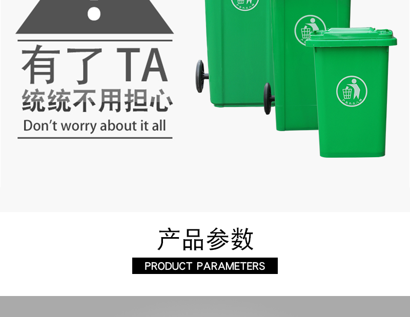 產(chǎn)品名稱 專用掛車塑料垃圾桶 產(chǎn)品型號 ZX-G240L 產(chǎn)品顏色 綠色 外桶材質(zhì) HDPE 規(guī)格(mm) 240L 產(chǎn)品重量 13-15KG 建議使用場景 公園、樓盤小...