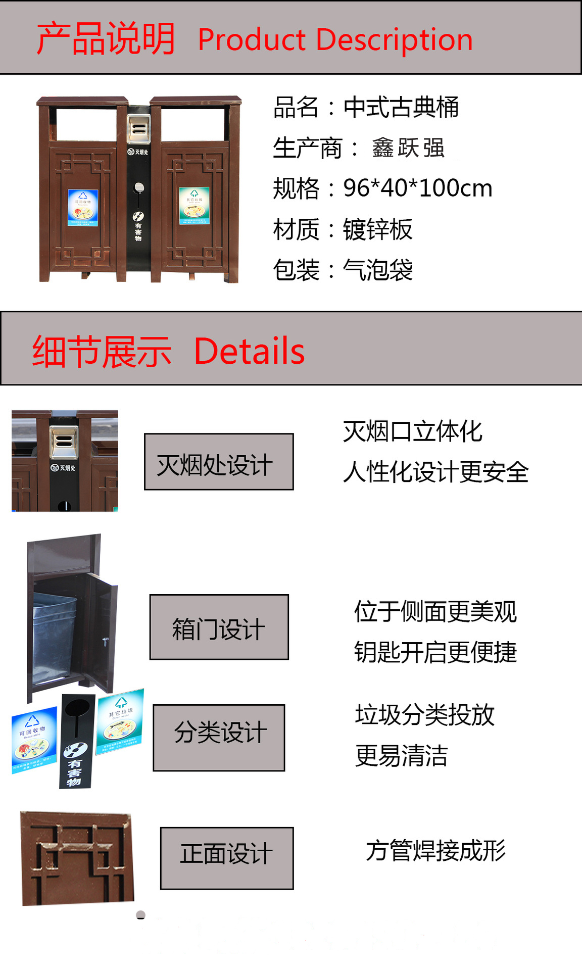 【品名】三分類垃圾桶 【品牌】 中星 【材質(zhì)】優(yōu)質(zhì)鍍鋅板 【內(nèi)膽】鍍鋅板、不銹鋼 【制作工藝】選用優(yōu)質(zhì)不銹鋼鋼板裁剪、壓制、折彎后再焊接而成型 【噴涂工藝】垃圾桶經(jīng)磷化噴砂處理后采用戶...