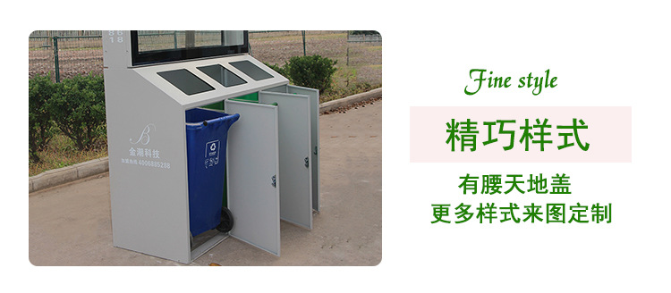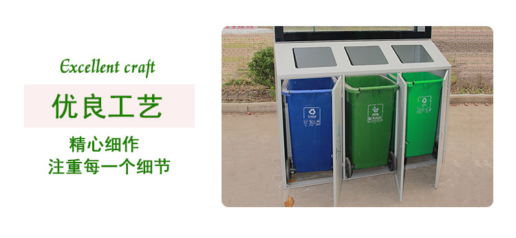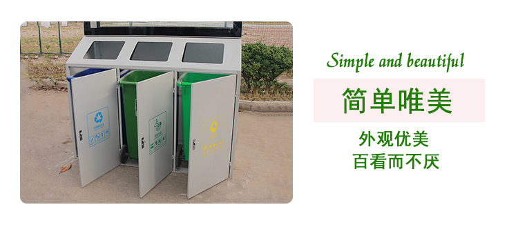 【品名】三分類垃圾桶 【品牌】 中星 【材質(zhì)】優(yōu)質(zhì)鍍鋅板 【內(nèi)膽】鍍鋅板、不銹鋼 【制作工藝】選用優(yōu)質(zhì)不銹鋼鋼板裁剪、壓制、折彎后再焊接而成型 【噴涂工藝】垃圾桶經(jīng)磷化噴砂處理后采用戶...
