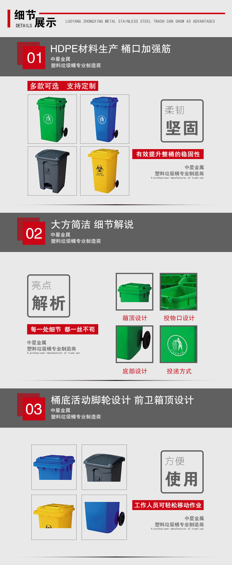產(chǎn)品名稱 660升塑料垃圾桶 產(chǎn)品型號 ZX-660L 產(chǎn)品顏色 綠色/灰色/藍色/黃色/紅色 外桶材質(zhì) 聚乙 內(nèi)桶材質(zhì) 聚乙烯 容量 660L 建議使用場景 街...